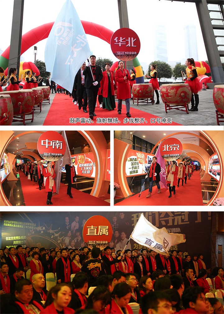 早上七点整,伴随着振奋人心的战鼓声,来自集团九大区的瑞源将士高举旗帜,雄赳赳、气昂昂地踏入会场。
